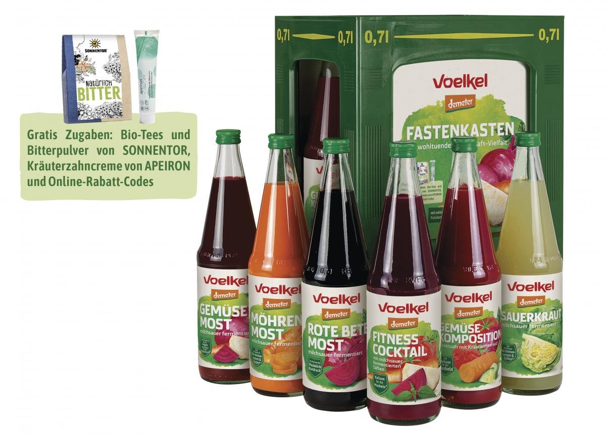 Zum Fasten alles im Kasten: Mit je einer 0,7 l Flasche Rote Bete Most, Möhren Most, Gemüse Most, Sauerkraut, Gemüse Komposition und Fitness Cocktail beinhaltet unser Fastenkasten alle Zutaten für ein 8-Tage-Saftfasten-Programm. Jetzt gratis dabei: Bio-Tees und Bitterpulver von SONNENTOR, Kräuterzahncreme von APEIRON und Online-Rabatt-Codes. Nur solange der Vorrat reicht.